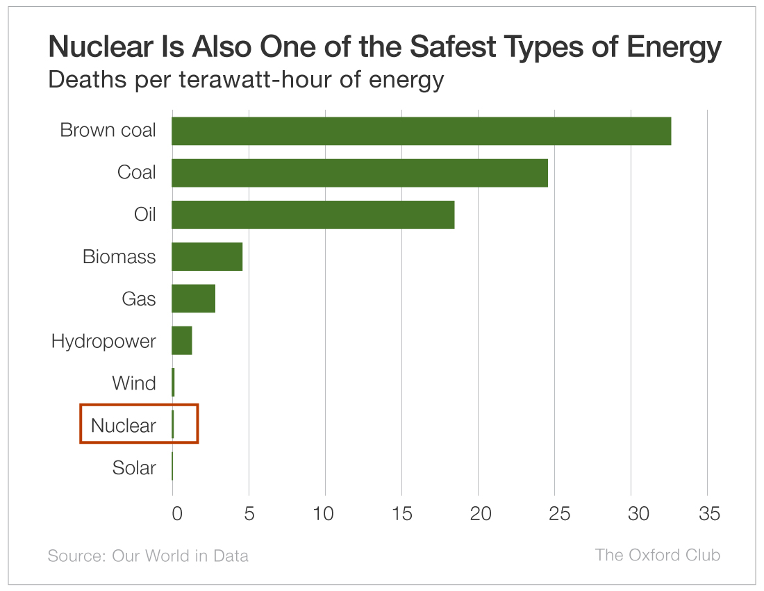 Nuclear power is also among the safest ways of producing electricity. Death rates are tracked in terms of both plant accidents and air pollution per terawatt-hour of electricity generated. As you can see in the chart below, the data speaks for itself. Nuclear power is dramatically safer than almost everything else.
