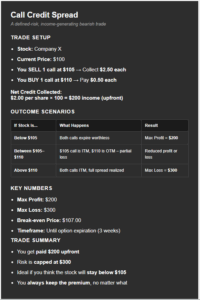 Let’s take a look at an example to illustrate. Say we open a credit spread on Company X, which is trading for $100, and we think it’s either going to rise higher over the next few weeks or fall only slightly.