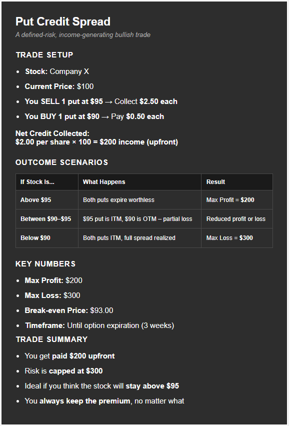 That means our net credit for this spread is $200, because we sold the $95 put for $250 and bought the $90 put for $50. That $200 net credit is also our maximum profit.