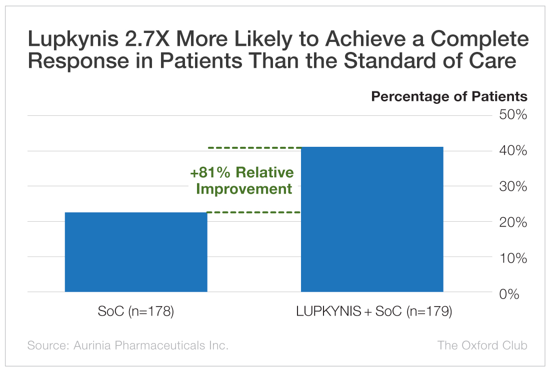 The normal treatments can keep the condition under control, but not as well as you might hope. Only 22.5% of patients treated with the standard drugs have a response and relief from the symptoms of their disease. Lupkynis nearly doubles that: 40.8% of patients treated with it have a full response and relief.