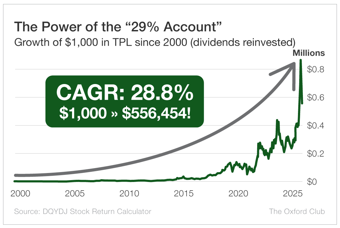 The “29% Account” − the asset that has returned an average of 29% per year since 2000, making it one of the very best performers in the entire market − is Texas Pacific Land (NYSE: TPL).