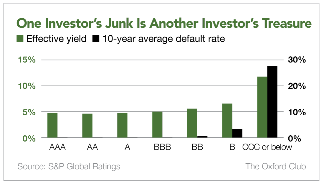 This is the part most investors miss: While the “junk” label is applied broadly, the reality isn’t so stark. In fact, in terms of risk, BB bonds and many B rated bonds are much closer to investment-grade than to the dicey world of CCCs.