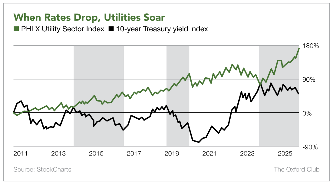 Combine all that demand with falling interest rates, and electric utilities are clearly a place to invest right now. (Utilities tend to borrow lots of money, so lower interest rates are decidedly bullish for the sector.)