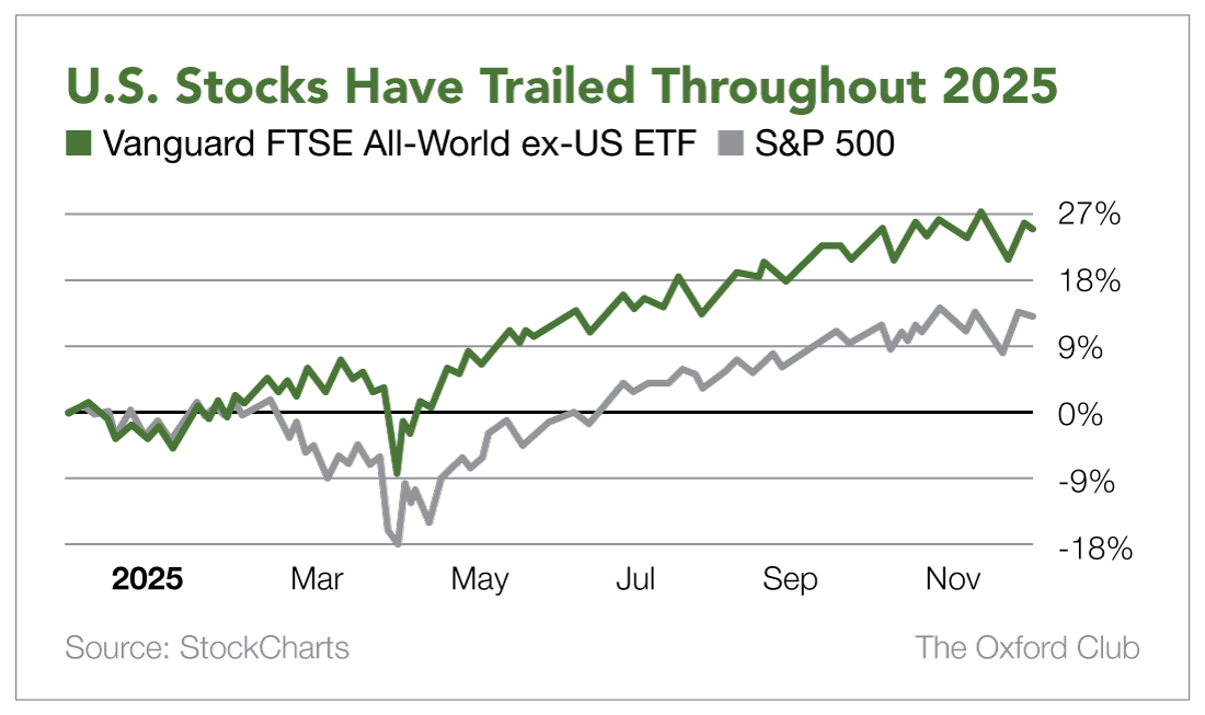 Plus, sometimes U.S. stocks lag the rest of the world. As of early December, stocks outside the U.S. have doubled the performance of the S&P 500 over the past 12 months.